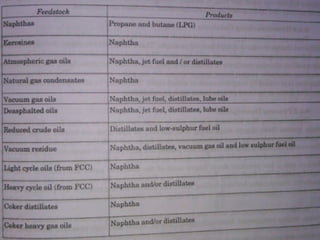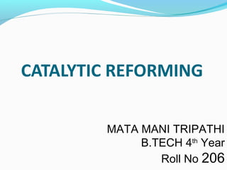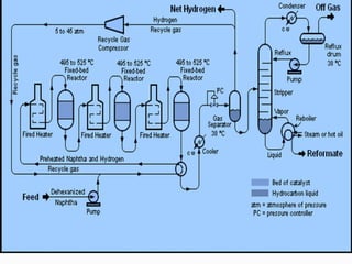 - Catalytic reforming converts low octane naphtha into high octane reformates through reactions like dehydrogenation and dehydrocyclization.
