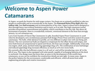 Aspen Power Catamarans specializes in mid-range cruisers featuring a revolutionary patented hull design called Power Proa, which enhances ride comfort, fuel efficiency, and seaworthiness. The company, founded in 2008 by Larry Graf, offers boats that combine innovative engineering with environmentally friendly features, including solar panels for battery recharging. With plans to expand their range to smart adventure yachts, Aspen aims to maximize the enjoyment of boating while reducing environmental impact.