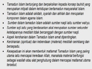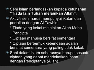 Seni Islam harus berlandaskan kepada konsep tauhid dan bertujuan untuk mendekatkan insan dengan Allah, serta mempertingkatkan nilai-nilai baik dalam masyarakat. Kesenian dalam Islam memperbolehkan imajinasi dan kreativitas selama berada dalam batasan syariat, dengan menekankan pada ketidakabadian segala ciptaan manusia. Prinsip seni Islam meliputi kesedaran akan keesaan Allah dan menolak simbol perantara dalam hubungan dengan Tuhan.