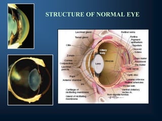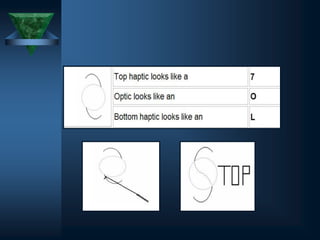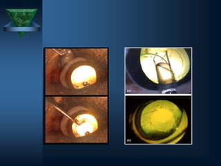 This document provides information on cataract surgery and intraocular lens implantation in dogs. It discusses the structure of the normal eye, different types and classifications of cataracts. It describes various surgical techniques for cataract removal including discission and aspiration, extracapsular extraction, and phacoemulsification. It also covers patient selection, pre-operative care, anesthesia, intraocular lenses, and post-operative care and complications. The goal of cataract surgery is to remove the opaque lens and restore vision through implantation of an intraocular lens.