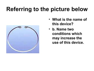 The document discusses an intra capsular tension ring, a device used to expand the capsule following significant zonulolysis. It may be used to treat conditions like Marfan's syndrome and pseudo exfoliation syndrome that can cause zonulolysis and require increased capsular support. The document provides the name of the device, asks for two conditions where its use may increase, and gives the answer naming the device as an intra capsular tension ring and listing Marfan's syndrome and pseudo exfoliation syndrome as two conditions.