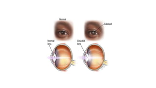 Cataract is a cloudy area in the lens of the eye that causes blurry or hazy vision. It is very common in older adults, affecting over half of those over age 80. Over time, cataracts can worsen vision and cause difficulty with tasks. Symptoms include blurry vision, faded colors, glare from lights, and frequent need for changed glasses prescriptions. Cataracts form as the lens proteins break down with age. Risk factors include diabetes, smoking, excess alcohol, family history, eye injuries, and sun exposure. Treatment is usually cataract surgery to remove the clouded lens and insert a clear artificial lens.