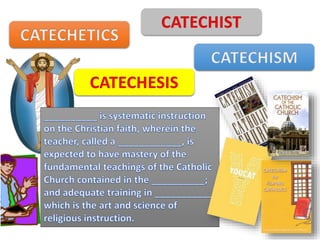 Catechesis can enrich preaching through employing a disciplined methodology that allows for creativity, having a sound doctrinal foundation, integrating faith and life, and being sensitive to diversity. Catechesis shares characteristics with evangelization as a teaching and maturation stage after initial conversion to help Christians know Christ better. It involves proclaiming the kerygma to non-believers and providing didache or instruction to converts. Catechesis should be Christocentric, scripturally rooted, authentically Filipino, and systematic while integrating the dimensions of faith - doctrine, morality, and worship. The challenges to catechesis today include materialism, secularism, and information overload. All Christians are called to be