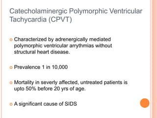 This document discusses catecholaminergic polymorphic ventricular tachycardia (CPVT), a condition characterized by adrenergically mediated polymorphic ventricular arrhythmias without structural heart disease. It has a prevalence of 1 in 10,000 and mortality of up to 50% before age 20 if untreated. The gold standard for diagnosis is exercise stress testing showing exercise-induced bidirectional or polymorphic ventricular tachycardia. Treatment involves lifestyle changes, beta-blockers, flecainide, and an ICD for those with cardiac arrest or recurrent arrhythmias despite medical therapy. Genetic testing identifies mutations in RYR2 or CASQ2 genes in the majority of cases.