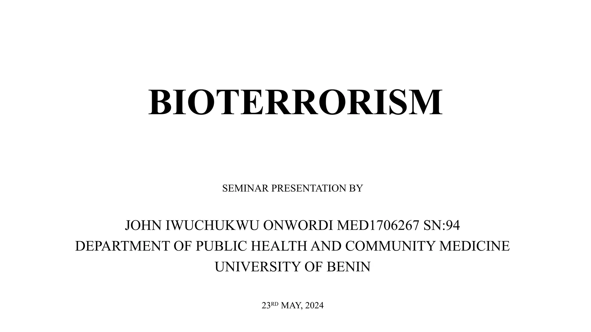 The document is a seminar presentation on bioterrorism by John Iwuchukwu, discussing its historical context, categories of agents, public health implications, and response strategies. It highlights the ongoing threat of bioterrorism, particularly in Nigeria, and stresses the importance of preparedness and coordination among healthcare professionals and government agencies. Recommendations are provided for various stakeholders including the government, public health departments, and communities to enhance response capabilities and public awareness.