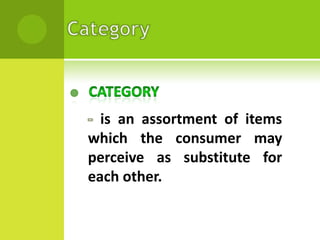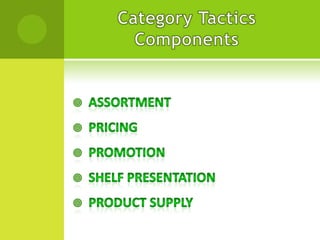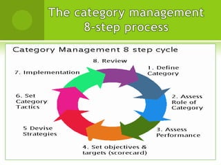This document outlines the key aspects of category management. It discusses that category management is a process where categories are managed as strategic business units to maximize sales and profits. It involves defining categories, assessing performance, setting goals and strategies, implementing category plans, and ongoing review. Category management is a collaborative approach where retailers and suppliers work together to deliver value to consumers.
