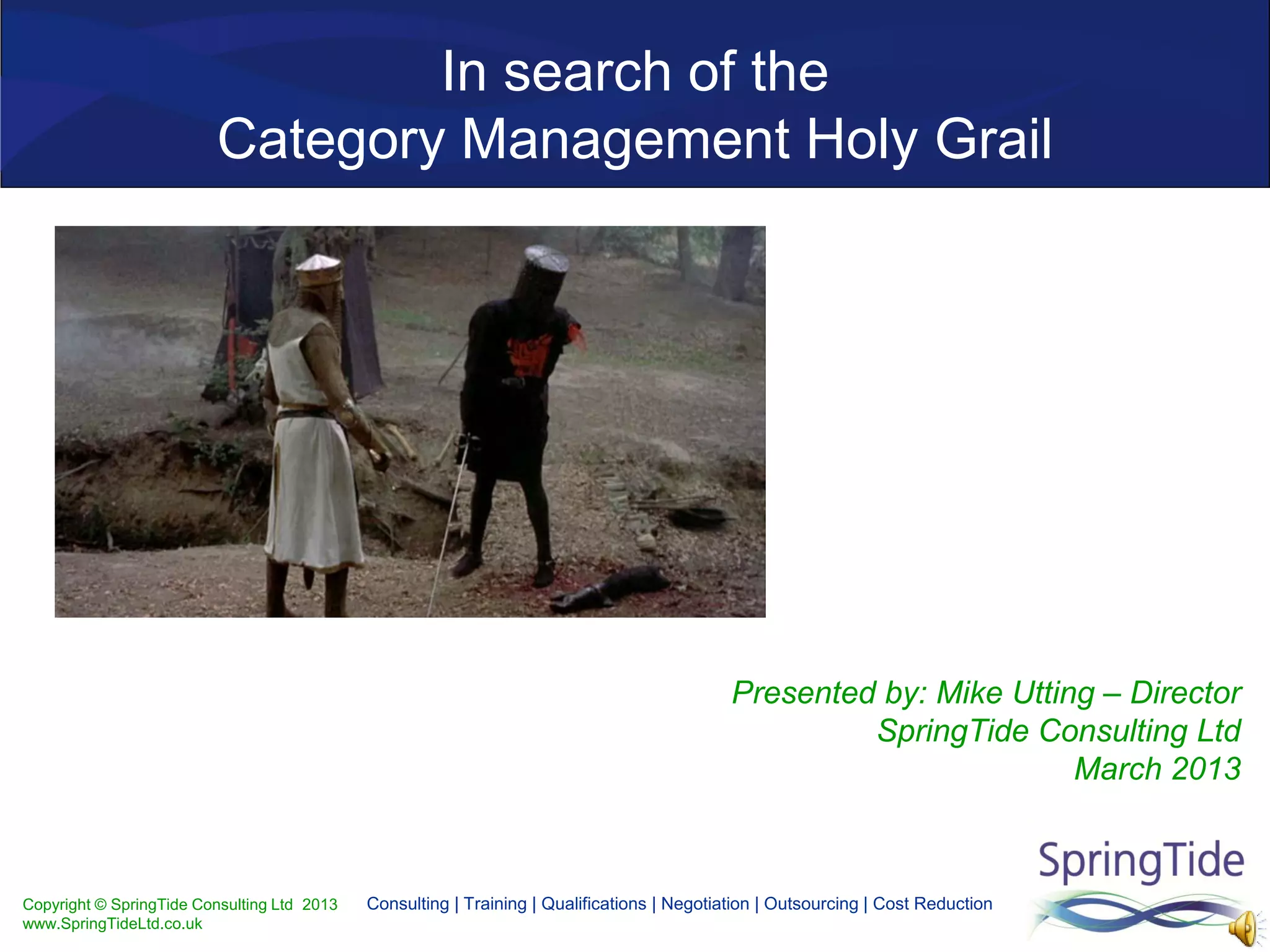 This document provides an overview of category management best practices. It discusses the importance of understanding category history, stakeholders, supply markets, and user needs. It emphasizes gathering data, developing options creatively, and implementing strategies that communicate success and benefits to all parties. The goal is to find the "Category Management Holy Grail" through collaborative relationships and continuous improvement.