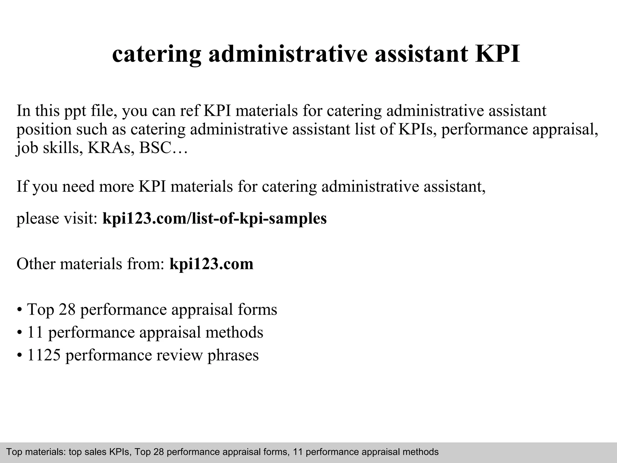 This document provides information and guidance about developing key performance indicators (KPIs) for a catering administrative assistant position. It discusses defining objectives and key result areas, identifying tasks, and determining how to measure results. The document cautions that KPIs should be limited to 3-5, change based on goals, and empower employees. Types of KPIs are also defined, including process, input, output, leading, lagging, outcome, qualitative and quantitative. Steps are outlined for building a KPI system and common mistakes to avoid.