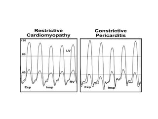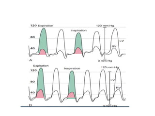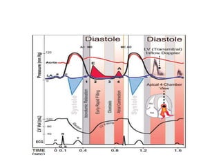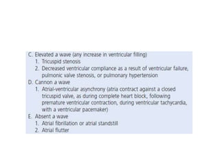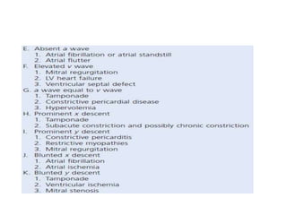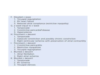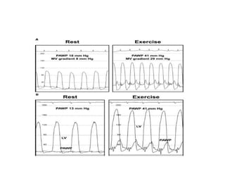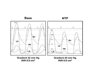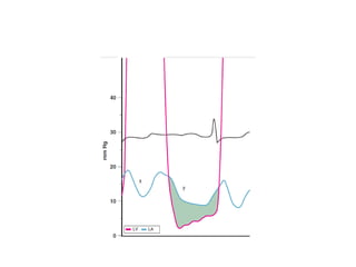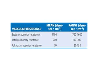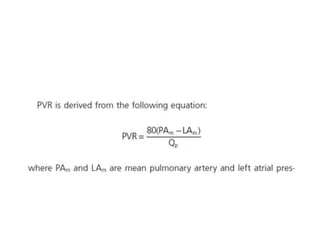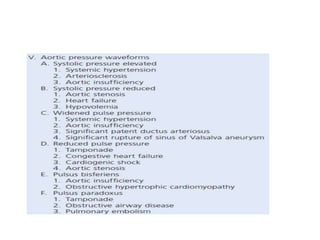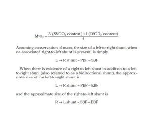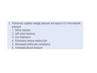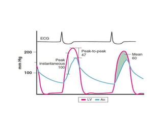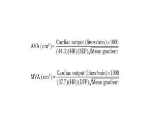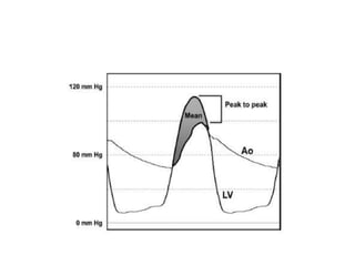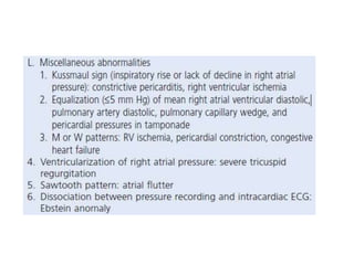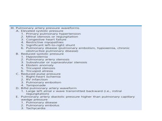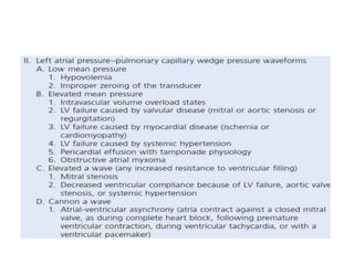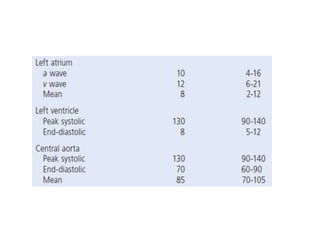 The document summarizes key aspects of cardiac catheterization and hemodynamic data collection. It describes the normal cardiac cycle, pressure measurement systems, normal pressure waveforms, methods to measure cardiac output like thermodilution and Fick, how to evaluate valvular stenosis and regurgitation, determine vascular resistance and shunts. Specific details are provided on assessing aortic stenosis, mitral stenosis, right-sided valves and quantifying regurgitant fractions. Oxygen saturation analysis and Fick principles are outlined for shunt determinations.