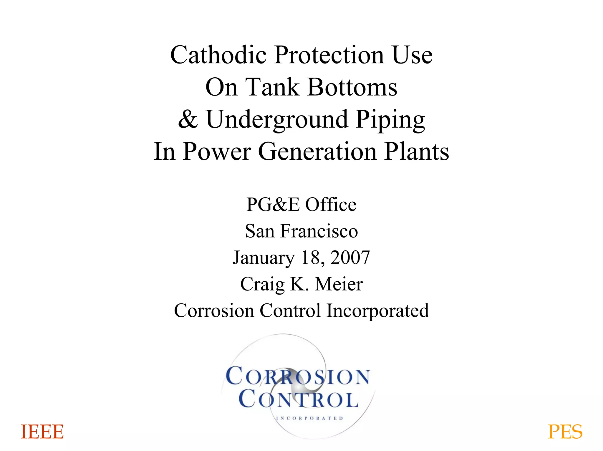 The document discusses cathodic protection for tanks and underground piping in power generation plants. It covers corrosion processes and principles of cathodic protection, design requirements for galvanic and impressed current systems, construction and testing procedures, and ongoing monitoring and maintenance. Proper planning, installation, and maintenance of cathodic protection can significantly extend the service life of steel structures at a plant for over 30 years.