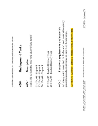 3??B'2?B7HQGHUB'RF?B6(?51BB0BLYLO?)LQDO'RF?)XHO)DUPB?6(5 BUHYB$YLDWLRQB)XHO)DUPB6SHF6SHF'2 0DQXDOVDQGKDQGVRQH[HUFLVHVEDVHGRQWKHVDPH 8QGHUJURXQG7DQNV 'HVFULSWLRQ 7KHVFRSHLQFOXGHVWKHIROORZLQJXQGHUJURXQGWDQNV 7$6ORSWDQN 7$6ORSWDQN 7$6ORSWDQN 7$3URGXFW5HFRYHU7DQN 7$3URGXFW5HFRYHU7DQN )XQFWLRQDOUHTXLUHPHQWVDQGPDWHULDOV $OOXQGHUJURXQGWDQNVVKDOOEHGRXEOHZDOOVWHHOWDQNVZLWKFDSDFLW FRQQHFWLRQVDQGDSSXUWHQDQFHDVVKRZQRQWKHGUDZLQJV $FRPSOHWHVVWHPRIFDWKRGLFSURWHFWLRQVKDOOEHSURYLGHG$FRPSOHWHVVWHPRIFDWKRGLFSURWHFWLRQVKDOOEHSURYLGHG