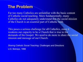 Catholic social teaching is an essential part of Catholic identity and faith formation. It is rooted in biblical themes of justice and God's preferential option for the poor and vulnerable. The Church's social mission and promotion of justice, human dignity, and the common good are constitutive elements of what makes a community authentically Catholic. Sharing Catholic social teaching with both depth and competence is crucial for Catholic educators seeking to form students in the fullness of Church teaching.