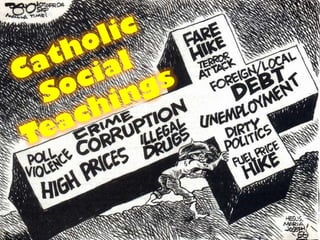 The document summarizes the 12 major documents of Catholic Social Teaching (CST) that provide moral principles and priorities to guide social action. It begins with Rerum Novarum in 1891 addressing workers' rights and conditions, and ends with Centessimus Annus in 1991 reviewing the Church's fundamental social teachings. The CST documents collectively address issues like economic systems, globalization, development, peace, modern society, and integral human development from economic, political, cultural and spiritual perspectives.