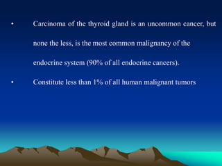 This document discusses the diagnosis and management of carcinoma of the thyroid gland. It covers the pathological classifications of thyroid cancer, clinical workup including imaging and biomarkers, staging systems, surgical and adjuvant treatment options, and long-term follow up. The main types of thyroid cancer are papillary, follicular, medullary, and undifferentiated carcinomas. Diagnostic testing includes ultrasound, biopsy, and serum markers. Treatment involves surgery such as lobectomy or total thyroidectomy, with or without radioactive iodine remnant ablation depending on risk level. Long-term monitoring uses thyroglobulin levels and imaging to detect recurrence.