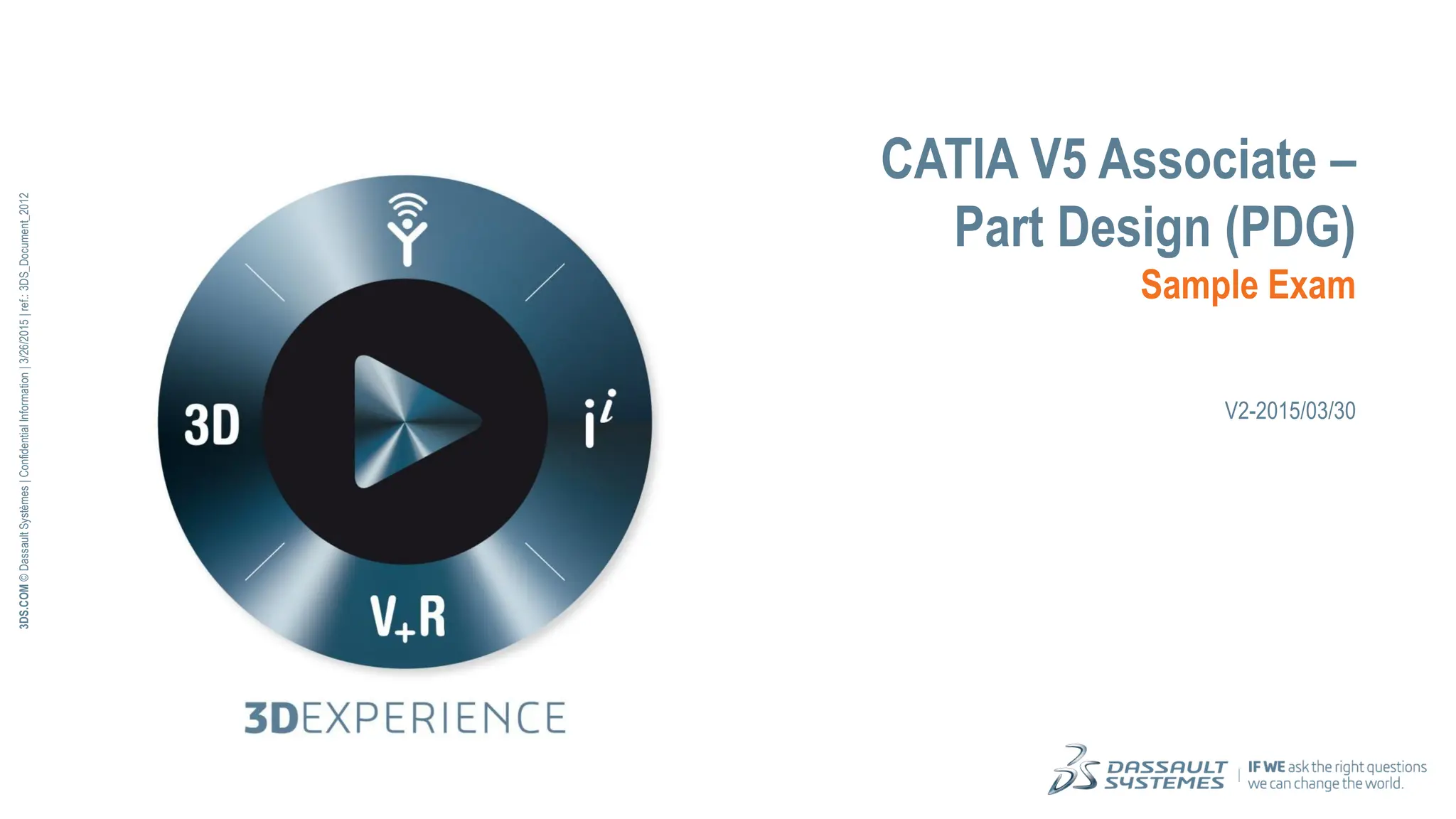 The document provides a sample exam for the CATIA V5 Associate - Part Design (PDG) certification, outlining the format and difficulty of the actual exam. It includes various questions related to drafting and part modeling, designed to simulate real exam conditions. The last section offers answers to the included questions, serving as a reference for users completing the sample exam.