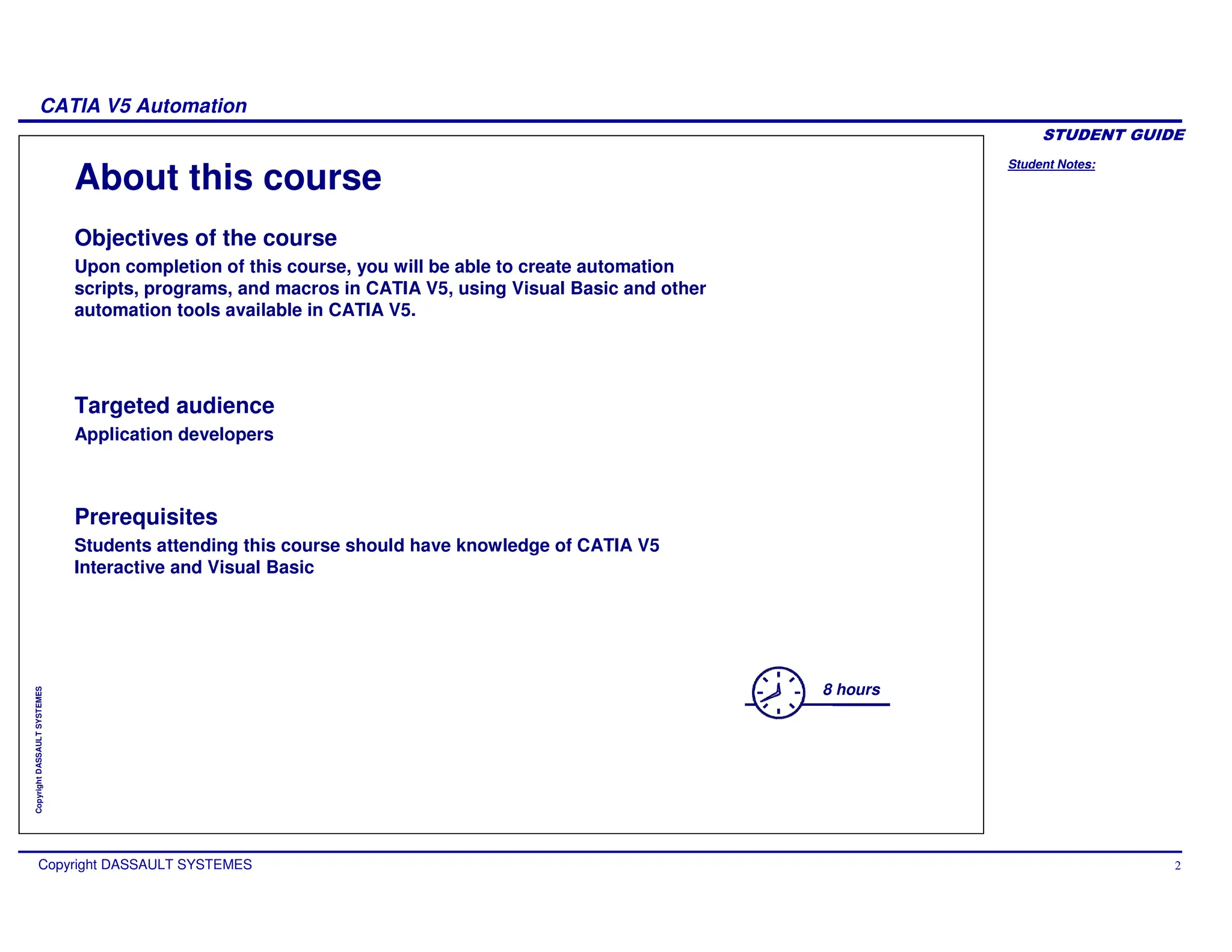 This document provides comprehensive notes on Catia V5 automation, focusing on scripting and programming with Visual Basic and related tools. It covers course objectives, prerequisites, various automation techniques, and scripting capabilities on both Windows and Unix platforms. Additionally, it includes a detailed table of contents listing specific topics such as macro recording, execution, and integration with external applications.