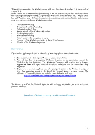 This catalogue comprisesthe Workshops that will take place from September 2010 to the end of