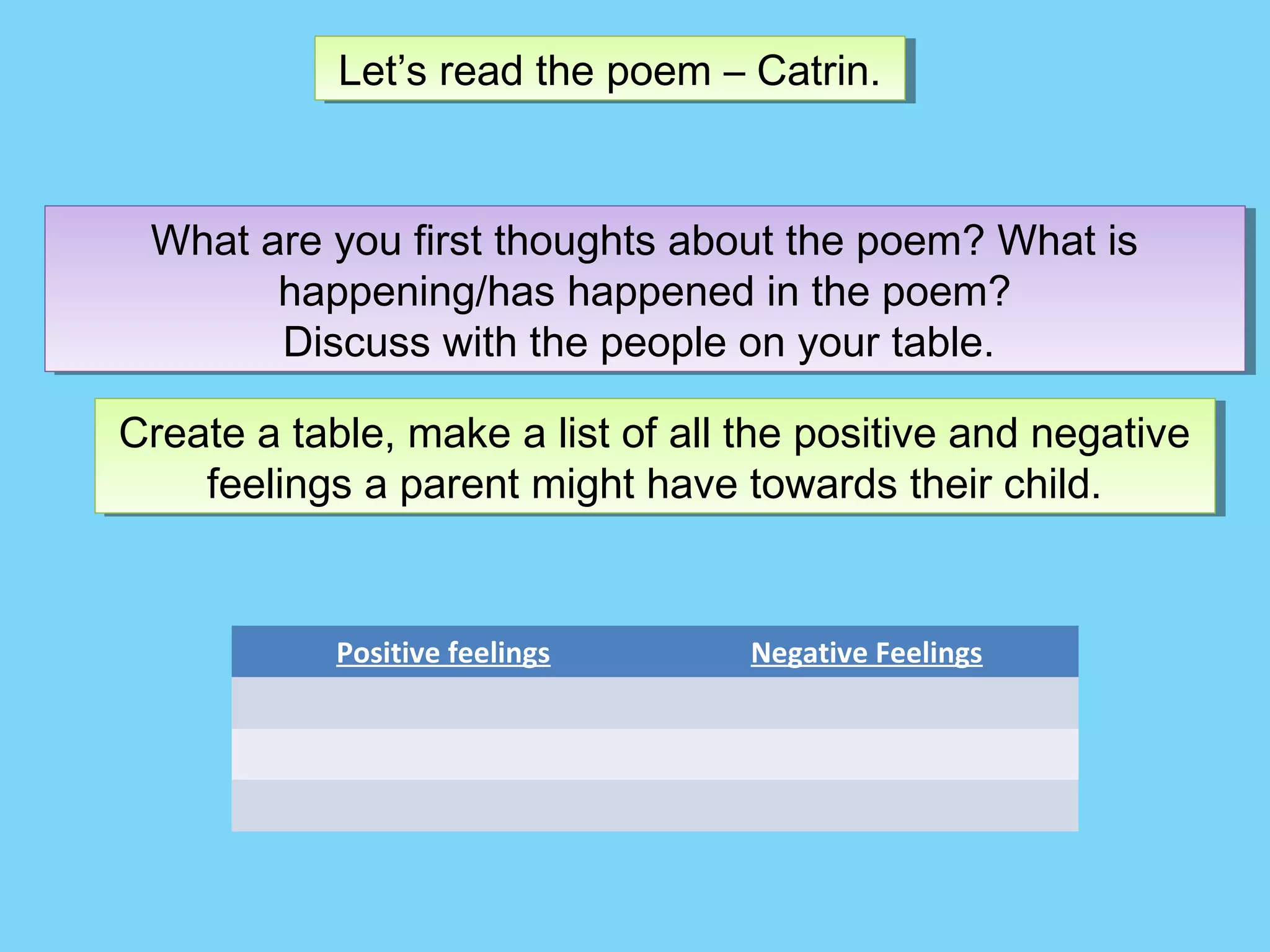 The poem "Catrin" by Gillian Clarke presents the complex relationship between a mother and her daughter. The mother recalls her daughter's birth and struggles with her growing independence as a teenager who wants more freedom. Throughout the poem, the mother uses vivid imagery to describe both the love and conflict within their relationship.