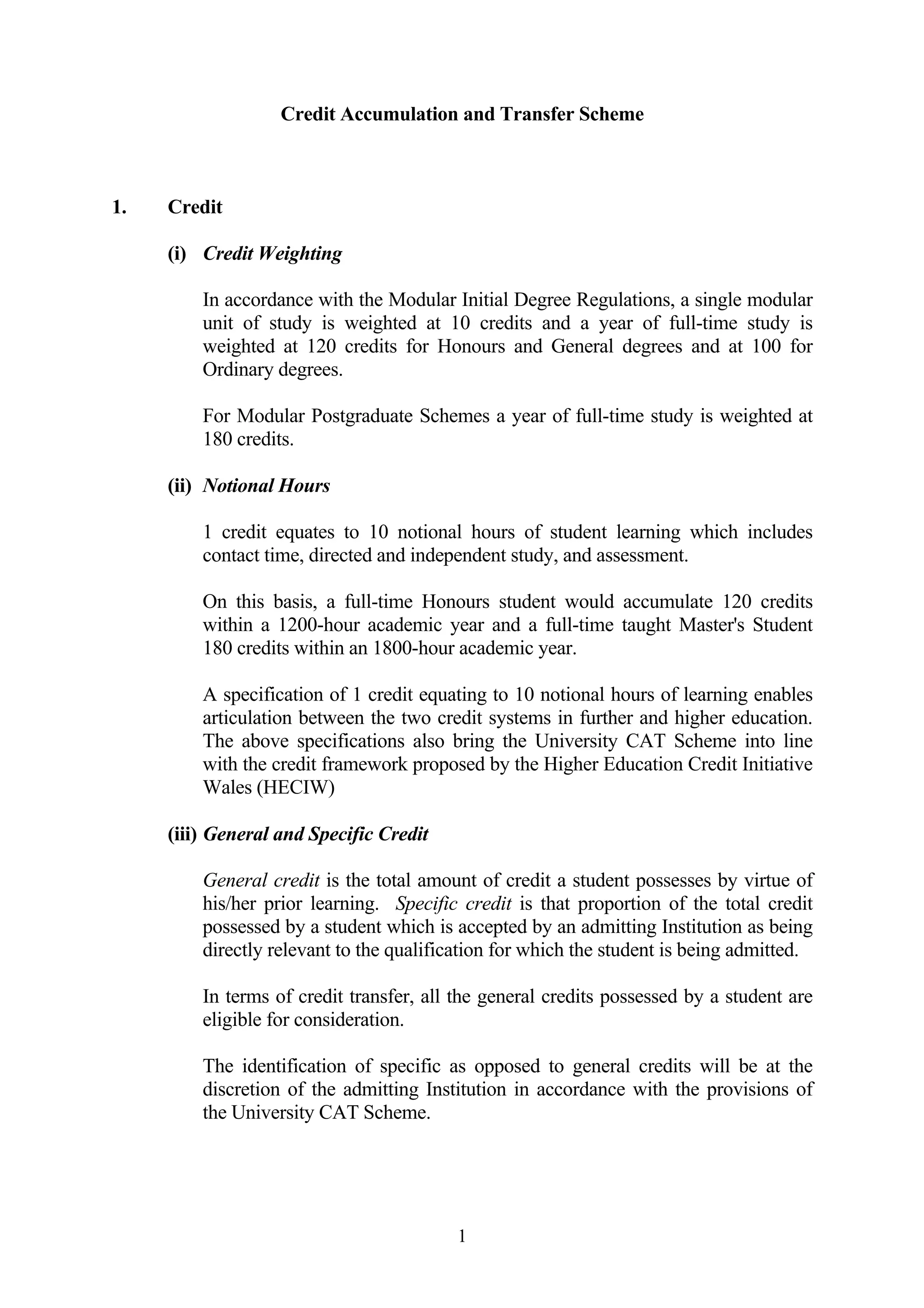 The document outlines the Credit Accumulation and Transfer Scheme (CATS) used by the university. It discusses (1) how credits are weighted and equated to student learning hours, (2) how modules are assigned levels, (3) the credit structures required for different qualifications, (4) assessment methods, (5) how qualifications can be awarded, and (6) limits on credit that can be transferred from other institutions.