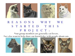 The document provides information about cats' nutritional needs and different cat food brands. It discusses the main nutrients cats require, including proteins, fats, carbohydrates, vitamins and minerals. It also lists several popular cat food brands and compares their prices, ingredients and nutrient contents. The document aims to educate people about proper cat nutrition and help them choose an affordable yet nutritious cat food.