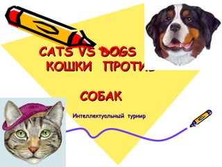 Документ содержит задания и активности для интеллектуального турнира на тему 'Кошки против собак'. Он включает в себя упражнения на счет, называние фруктов, овощей, дней недели, месяцев, животных и хобби, а также задачи на расположение слов в алфавитном порядке и нахождение рифм. Кроме того, документ предлагает задания на составление слов и сопоставление чисел с их названиями.