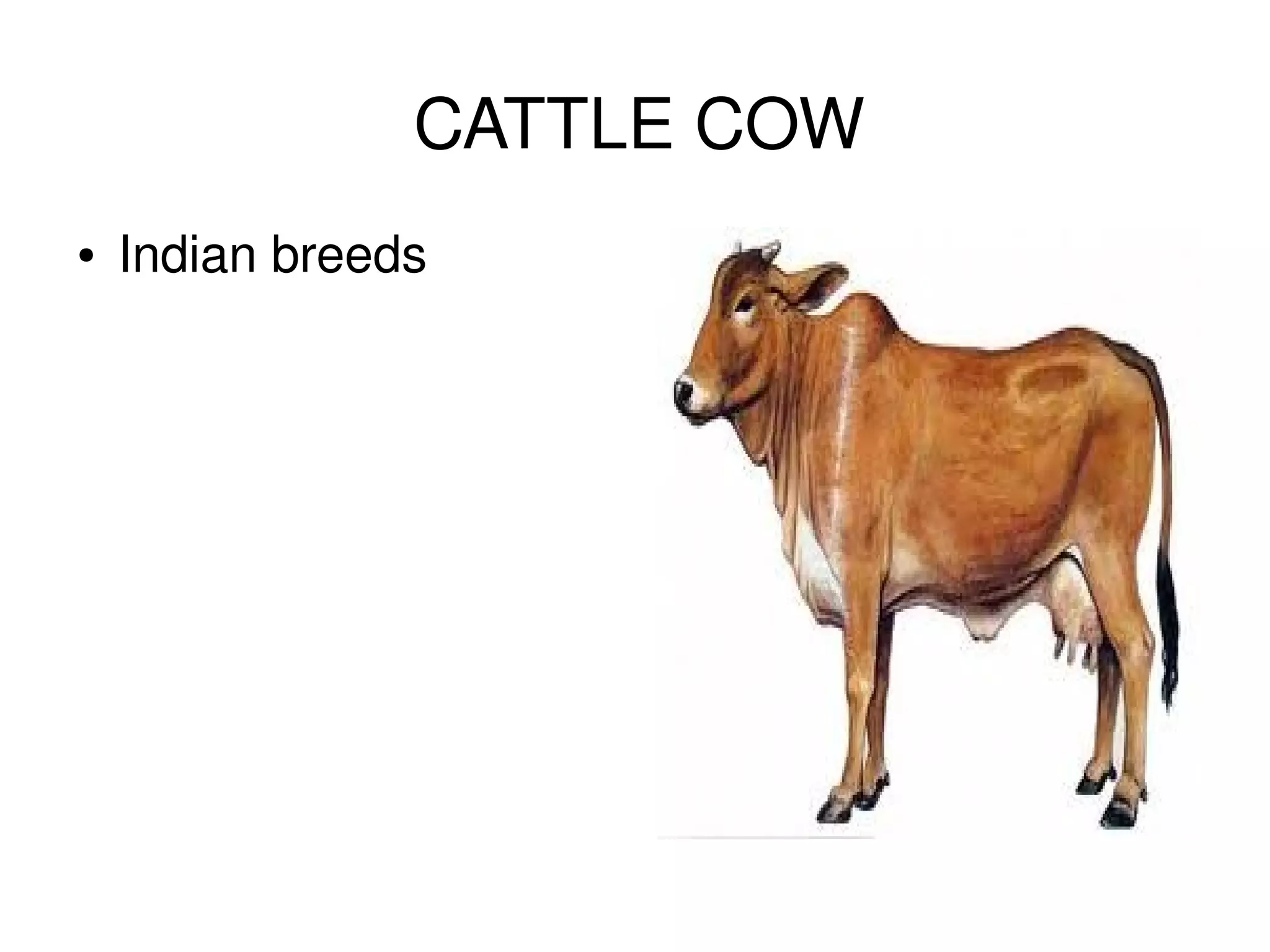 The document describes various Indian and foreign cattle breeds. For Indian breeds, it provides information on their place of origin, use as bullocks or milk yield, physical characteristics, color, and other facts. Foreign breeds described include Holstein, Jersey, Ayrshire, Brown Swiss, Guernsey, German Fleckvieh, Red Sindhi, Sahiwal, and Tharparker with details on their place of origin, color, weight, and other distinguishing qualities.