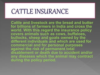 Cattle and livestock insurance policies provide coverage for animals such as cows, buffaloes, bullocks, sheep and goats owned by individuals that are used commercially or personally. The policies cover the risks of permanent disability or death of the animals due to accidents or diseases during the policy period. They cover deaths caused by accidents, diseases, surgeries, riots and strikes. The policies also cover permanent total disability of cattle. However, they do not cover willful injury, neglect, overloading, unskilled treatment, use of animals for unauthorized purposes, pre-existing accidents or diseases, intentional slaughter, theft or sale of insured animals, or losses due to war, nuclear events, or diseases within 15 days of the policy start