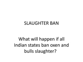 A nationwide ban on oxen and bull slaughter in India could significantly disrupt agriculture, livestock rearing, and the economy by reducing milk supply and increasing reliance on imported milk products. Such a ban would lead to job losses in the beef and leather industries, increased prices for alternative meats, and possible health threats from unregulated stray cattle. Historical data indicates that livestock populations have increased without slaughter bans, suggesting that such a prohibition may not be necessary for growth in the livestock sector.