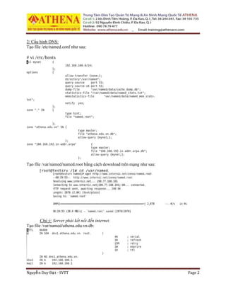 Tài liệu hướng dẫn cài đặt và cấu hình DNS trên CentOS 6.5, bao gồm cấu hình hostname và cài đặt các gói DNS cần thiết. Nó cũng chỉ ra cách tạo và cấu hình các file cần thiết trong hệ thống, cũng như việc tắt firewall để cho phép hoạt động của DNS. Các bước chi tiết được mô tả từ việc sửa đổi các file cấu hình đến việc khởi động lại dịch vụ DNS.