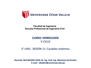 This document provides a summary of a hydrology course session on maximum flows. It discusses maximum flow definitions and calculations using direct methods like Manning's equation and empirical methods such as the Rational Formula. It also covers peak flow estimation using the Curve Number method considering factors like soil type, cover, and initial moisture conditions. The session concludes with recommendations for applying these methods to estimate maximum flows for hydraulic structure design.