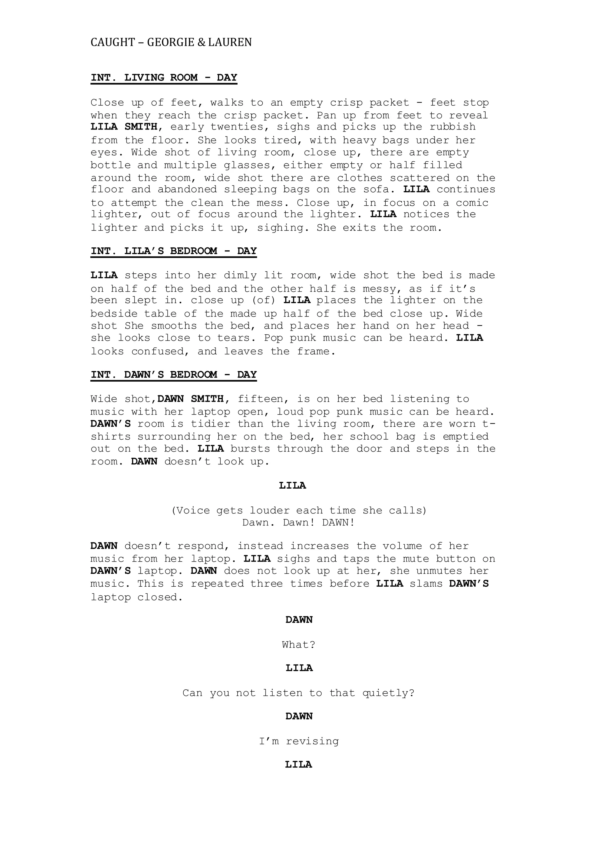 1) Lila cleans up after an apparent party at her home while her younger sister Dawn listens to loud music in her room.