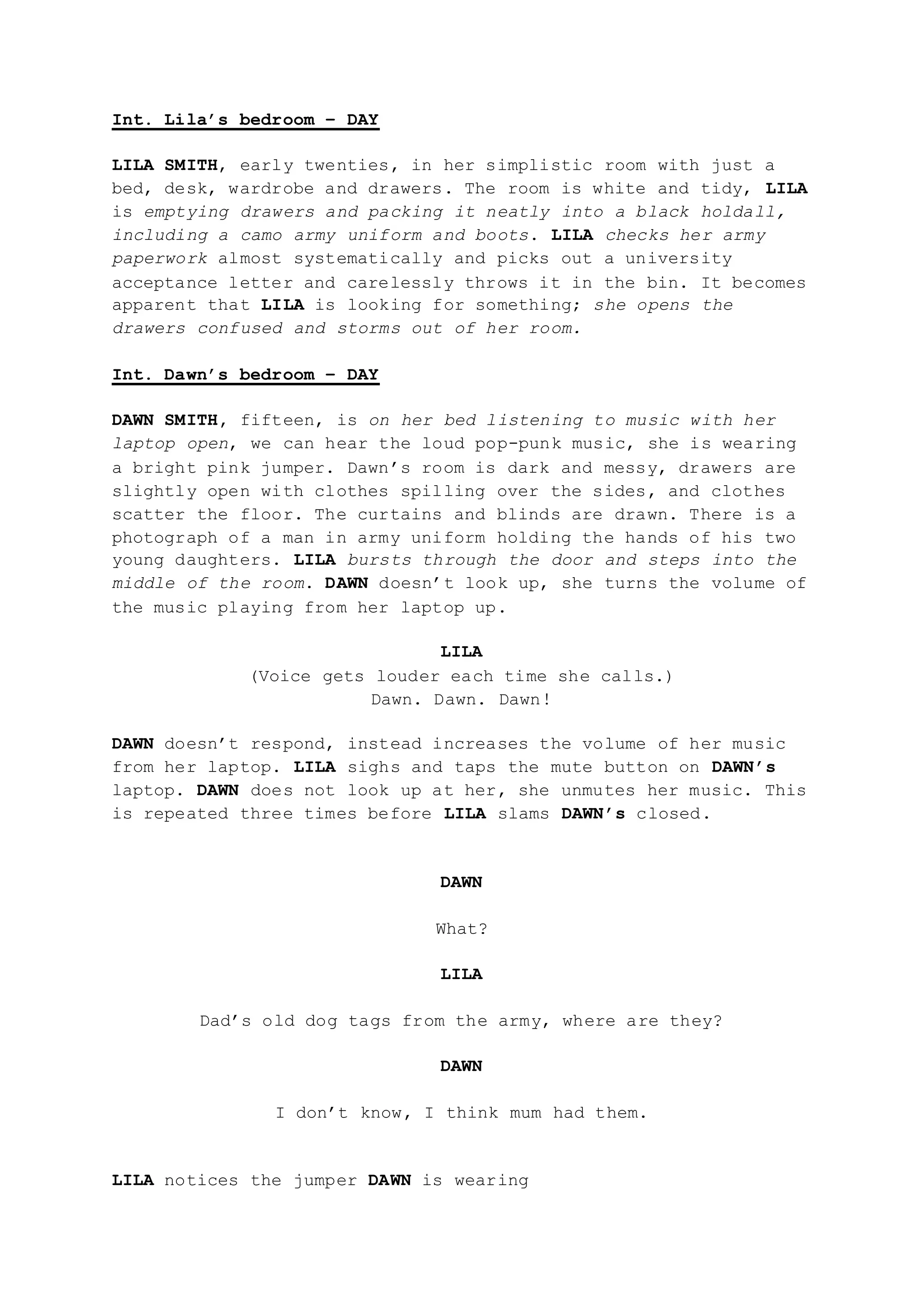 Lila is packing for her deployment in the army and searches for her father's old dog tags. She goes to her younger sister Dawn's room to ask about the tags' location. Dawn's room is messy and dark in contrast to Lila's tidy one. Dawn ignores Lila at first with her music. They argue about a pink jumper before Lila realizes Dawn is upset about her leaving. Dawn admits she doesn't know how she'll cope without Lila always being there, as their father left them before. Lila comforts Dawn and promises to return safely and continue being there for her.