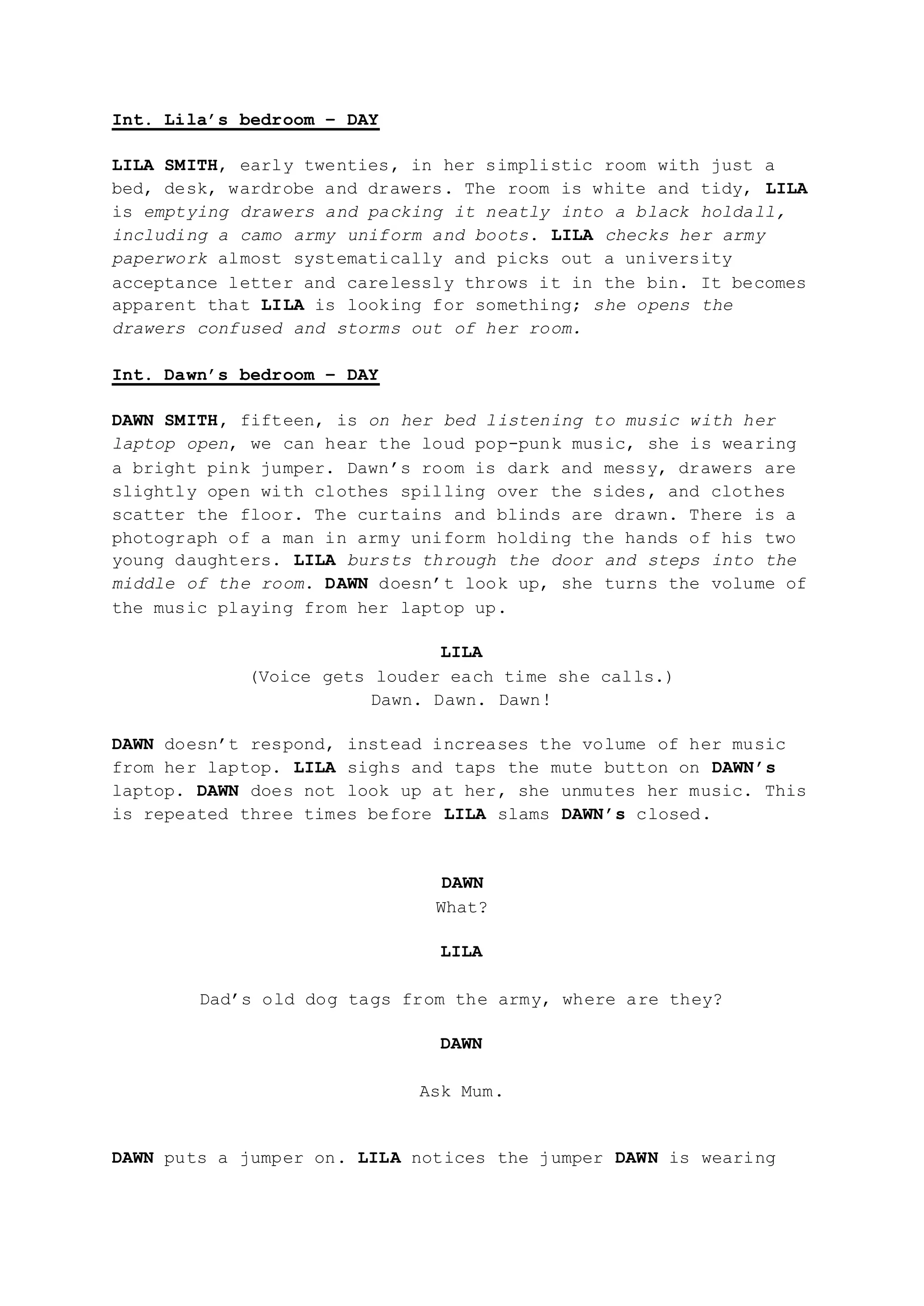 1) Lila is packing for her deployment in the army while emptying her drawers. She searches for her father's old dog tags but cannot find them.