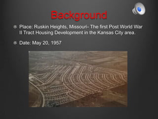 The document summarizes a tornado that struck Ruskin Heights, Missouri in May 1957, killing 39 people. It describes the path and intensity of the tornado through eyewitness accounts. It also discusses the inadequate warning systems and lack of storm shelters at the time, and how responses to the disaster helped improve emergency management. The author analyzes how a better warning system may have reduced casualties given most homes lacked basements. The response was well-coordinated despite limited resources, and informed future improvements to radar, sirens, and public education.