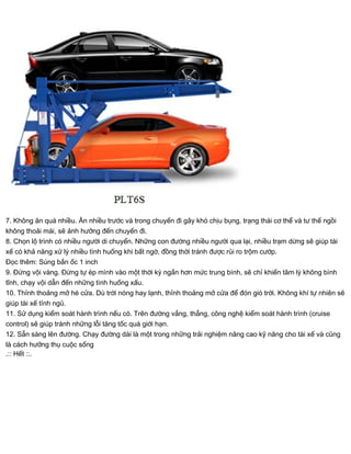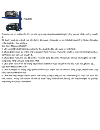 Tài liệu chia sẻ những kỹ năng và lưu ý để tài xế tận hưởng chuyến đi dài thoải mái và an toàn, bao gồm việc chuẩn bị tâm trạng, âm nhạc và chế độ ăn uống hợp lý. Ngoài ra, cần kiểm tra phương tiện trước khi khởi hành và chọn lộ trình an toàn với nhiều người đi lại. Cuối cùng, tài xế nên giữ trạng thái bình tĩnh và tránh vội vàng trong hành trình.