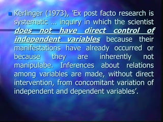 This document discusses causal-comparative research, which studies cause-and-effect relationships between variables that are not manipulated by the researcher. It examines how causal-comparative research explores how independent variables influence dependent variables after the fact, without experimenter control. Some key points made are that this method is used when manipulation is impossible for ethical or practical reasons, and helps study problems that can't be replicated experimentally, though it is limited by a lack of control over variables.