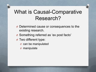 Causal-comparative research aims to determine cause-and-effect relationships by forming groups of individuals in whom an independent variable is present or absent - or present at several levels - and comparing the groups on a dependent variable. It involves comparing two or more groups that differ on some independent variable of interest without direct manipulation. Threats to internal validity include subject characteristics and other threats like mortality, instrumentation, and history. Researchers evaluate these threats and aim to control for them to strengthen causal inferences from the research.