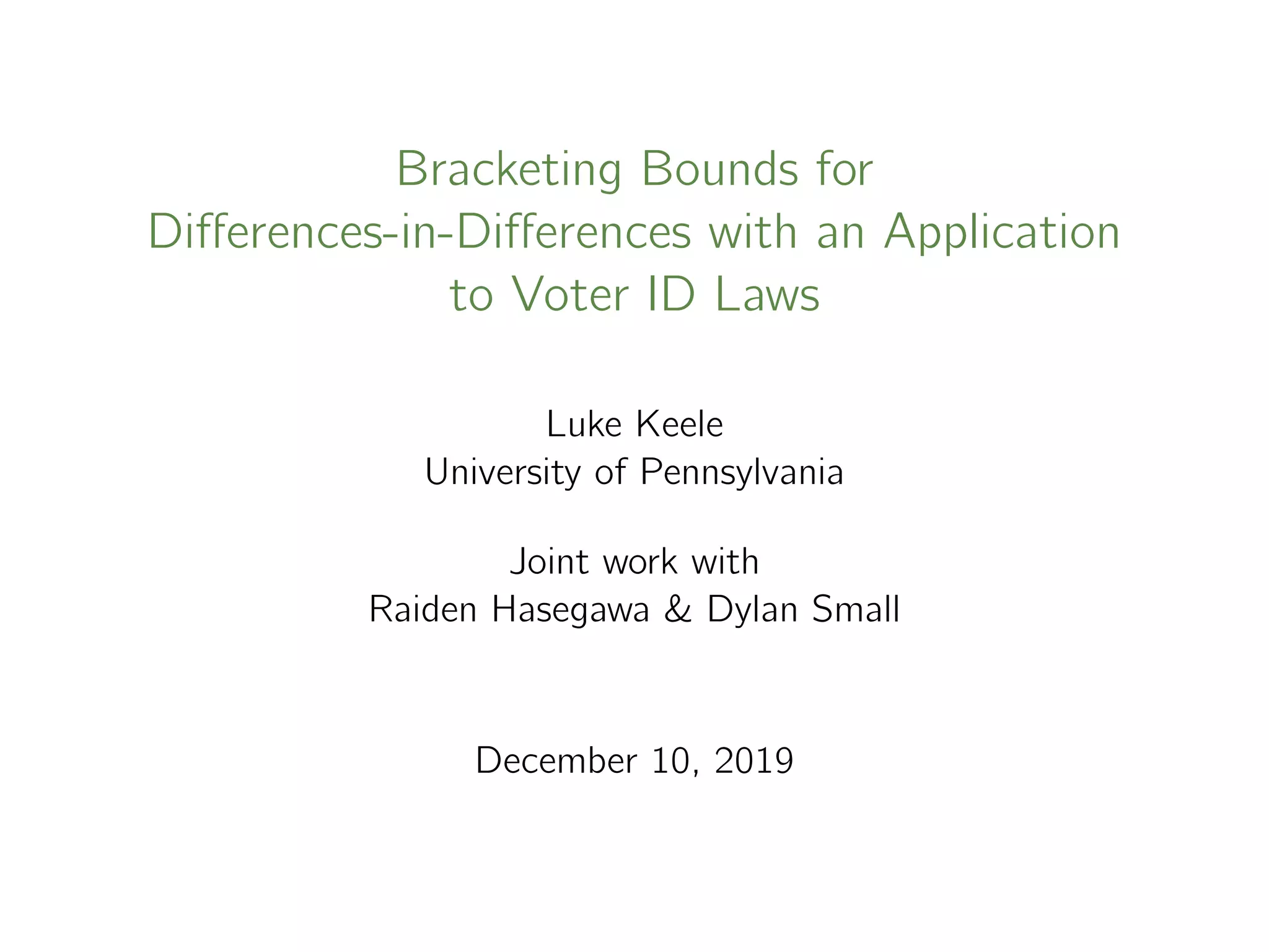 The document discusses the use of differences-in-differences (DiD) methodology for estimating causal effects, specifically in the context of voter ID laws in Indiana and Georgia. It reviews assumptions, diagnostics, and introduces a new bracketing estimator to address potential confounding effects arising from selective maturation. Key findings highlight the importance of constructing appropriate control groups based on past turnout levels to improve the accuracy of causal estimates in electoral studies.