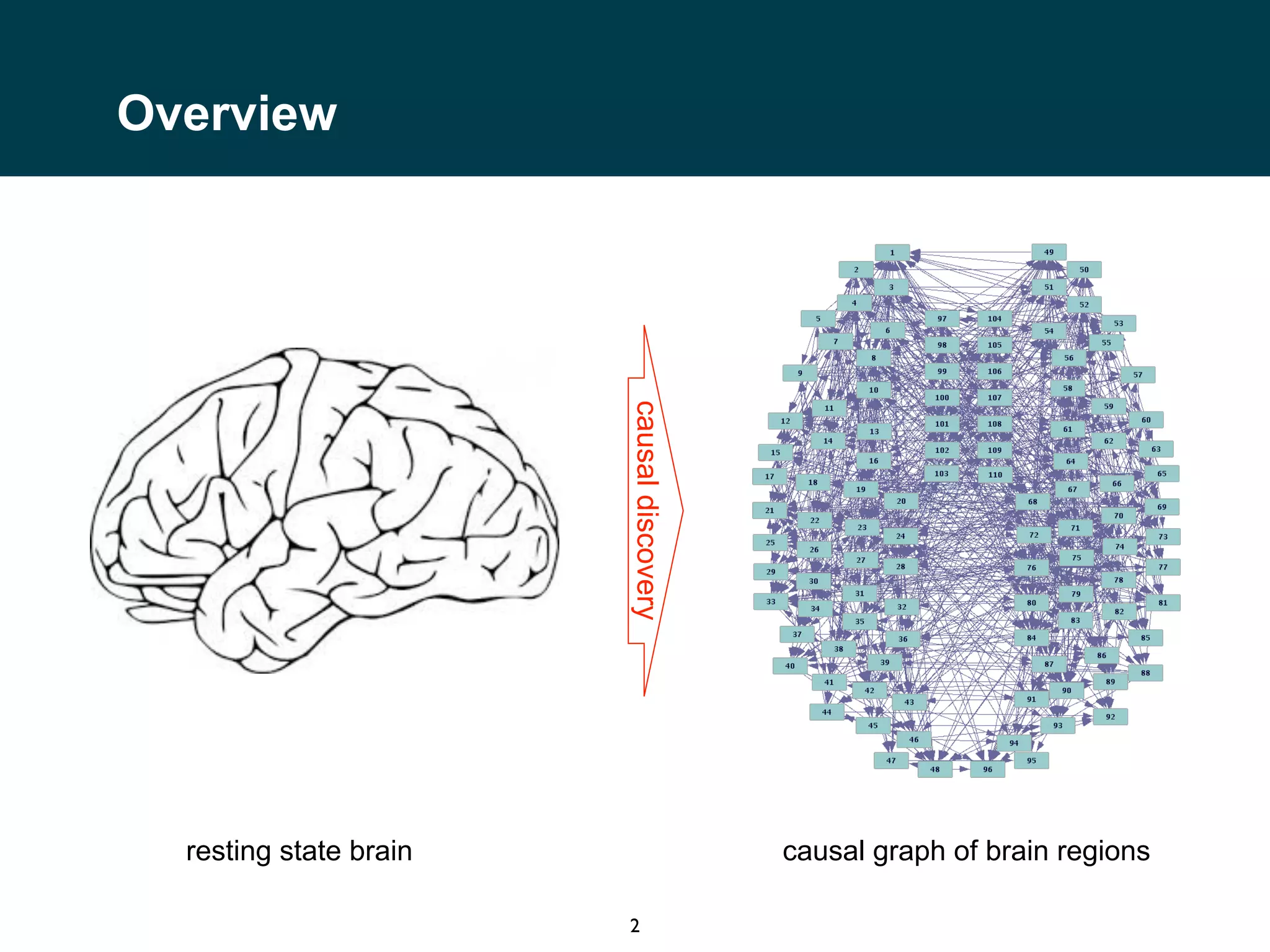 The document discusses causal discovery in neuroimaging data, specifically focusing on resting state fMRI from the Human Connectome Project. It outlines the experimental setup, including parameters for data acquisition and the nature of measurements taken, such as the correlation of bold signals across multiple brain regions. The aim is to analyze interactions and neural activity across a vast number of neurons and voxels over time.