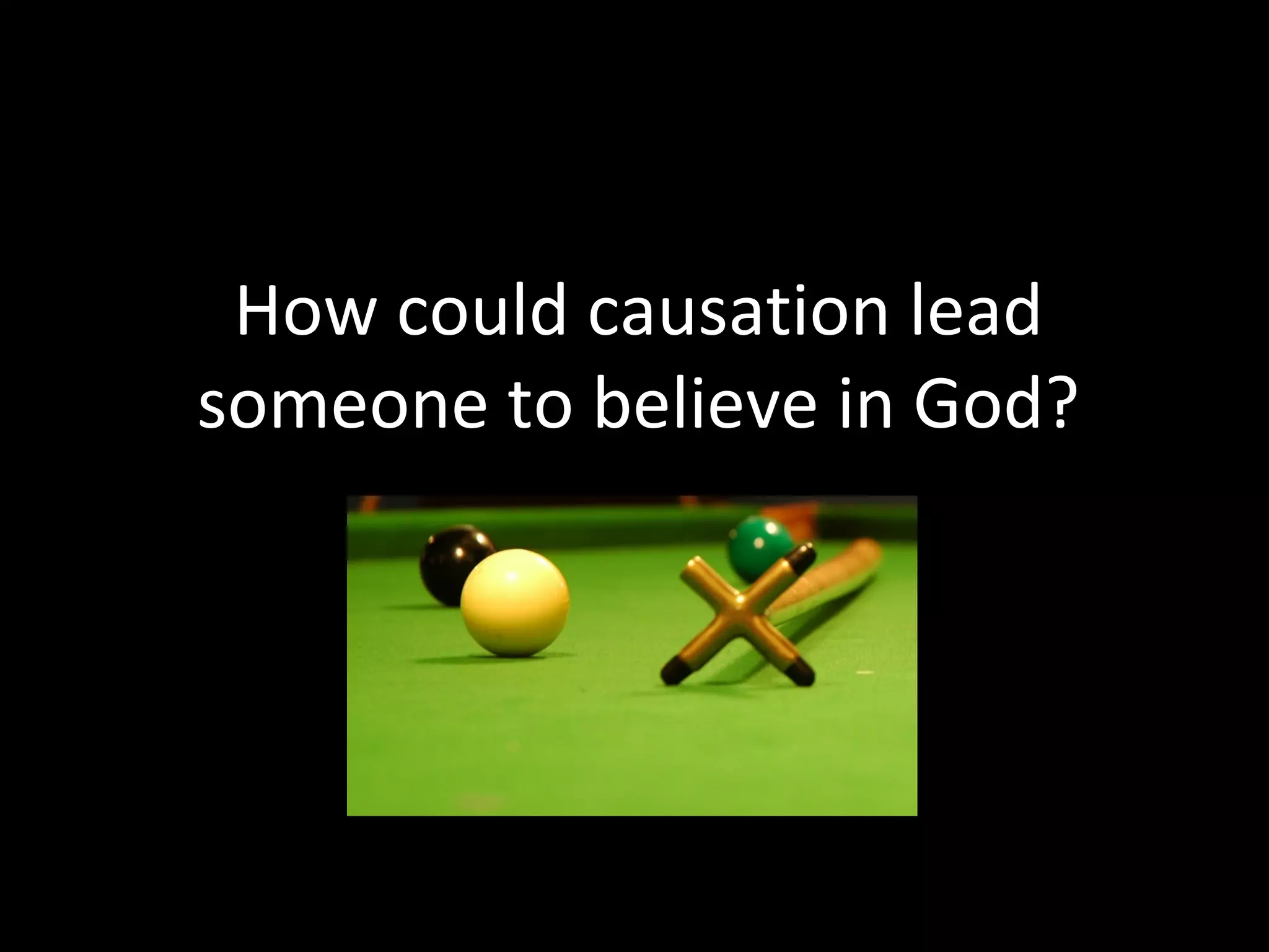 The document explores the concept of causation and its implications for belief in God, particularly through the argument that there must be a first uncaused cause which is God. It outlines the strengths and weaknesses of this argument, referencing St. Thomas Aquinas' perspective and providing analogies, such as the snooker ball analogy, to demonstrate causation. The document also includes potential exam questions related to causation and belief in God.