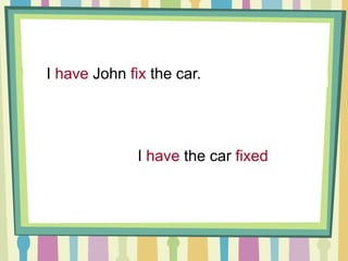 The document discusses causative structures in English. There are two basic causative structures - active and passive. In the active structure, one person causes another to do something, such as "I had John fix the car." In the passive structure, something is caused to be done but the agent is not specified, such as "I had the car fixed." Common causative verbs are have, get, make, and let. Have and get can be used in both active and passive structures, while make implies forcing someone and let implies allowing.