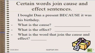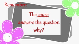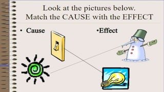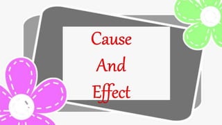 The document discusses cause and effect, defining cause as the first event that makes something happen, and effect as the second event or result. It provides examples of cause and effect relationships, such as a wet floor causing someone to slip and fall. Cause is presented as the reason for an occurrence, while effect answers the questions of what happened as a consequence.