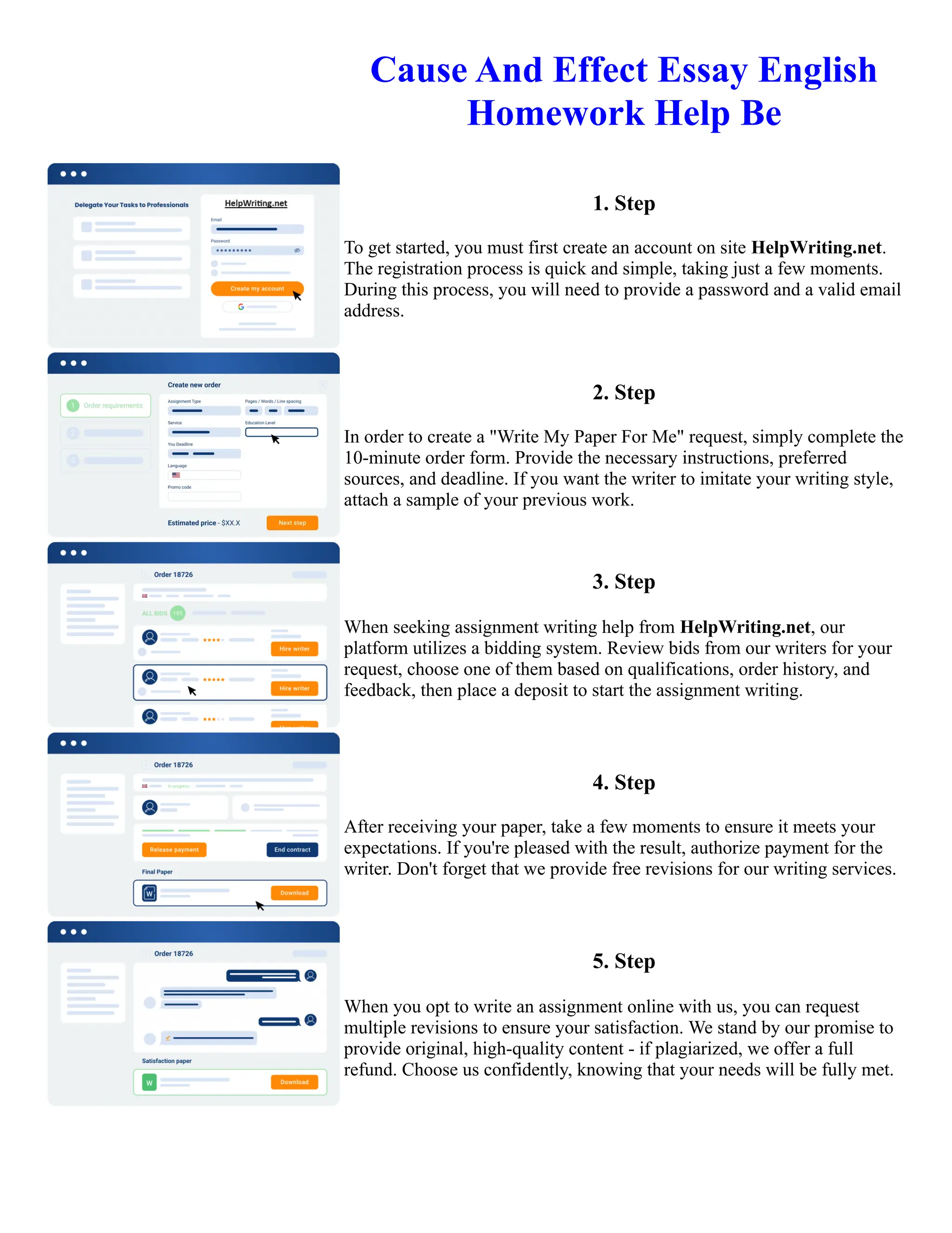 The document provides instructions for requesting and receiving help on an assignment from the website HelpWriting.net. It outlines a 5-step process: 1) Create an account with an email and password. 2) Complete an order form with instructions and deadline. 3) Review bids from writers and select one. 4) Review the completed paper and authorize payment. 5) Request revisions until satisfied, with a refund option for plagiarism.