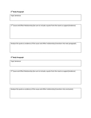 This document outlines the structure for a cause and effect essay, including an introduction with a hook, universal concept, and thesis statement. Three body paragraphs are then outlined, each with a topic sentence, cause and effect relationship supported by a quote from a novel, and analysis of the quote. The conclusion restates the thesis, reviews main points, and leaves the reader with something to consider.