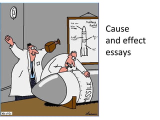 This document provides guidance and templates for writing a cause and effect essay. It discusses identifying the causes or effects in the thesis statement, focusing on how rather than why, and organizing the essay. Outlines are given for paragraphs discussing causes or effects, with suggestions for topic sentences, details, and transitional words. Sample prompts are also provided for selecting an essay topic. The overall document serves as a reference for properly structuring and writing a cause and effect essay.