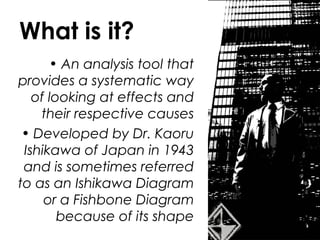 The document describes the steps to create a cause-and-effect diagram, also known as an Ishikawa or fishbone diagram, which is a visual tool for identifying potential causes of a particular effect or problem. It lists 6 steps: 1) define the effect, 2) draw the spine and effect box, 3) identify main cause categories, 4) identify specific causes, 5) drill down on causes, and 6) analyze the diagram. An example diagram shows potential causes for the inaccurate submission of billing to clients, with repeated causes like poor training and a manual filing system identified for corrective action.