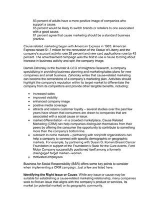 Cause related marketing is an effective strategy for companies to differentiate themselves, improve their image, and increase sales and customer loyalty. When companies support worthwhile causes that are related to their business or values, most consumers will switch brands or have a more positive opinion of that company. Surveys show over 80% of consumers are influenced by a company's support of charitable causes and will choose brands associated with causes. Partnering with nonprofit organizations allows companies to connect with specific markets and attract new customers. Done right, cause branding benefits both businesses and the social causes they support.