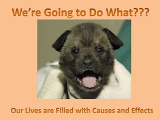The document provides guidance on writing a cause and effect essay. It discusses identifying a topic with a clear relationship between causes and effects. Students are advised to brainstorm potential causes and effects, and organize these graphically to clearly see the relationships. The document also provides tips for structuring the essay, such as using chronological, least obvious to most obvious, or least to most important order. It suggests transitional words to link causes and effects like "because," "therefore," and "consequently." Finally, it lists some potential topics that could be analyzed in terms of causes and effects, such as the effects of air pollution, smoking, or being an athlete.