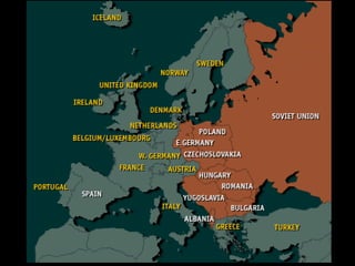 The document discusses key events and developments that characterized the Cold War between the United States and Soviet Union, including the Truman Doctrine that aimed to limit the spread of communism through economic aid, the Marshall Plan that rebuilt Western Europe, the formation of opposing military alliances like NATO and the Warsaw Pact, tensions over the occupations of Eastern Europe and Berlin at the end of WWII, the impact of communist takeovers in China and Korea, and how both superpowers sought to spread their political and economic influence globally during this era of hostility without direct military conflict.
