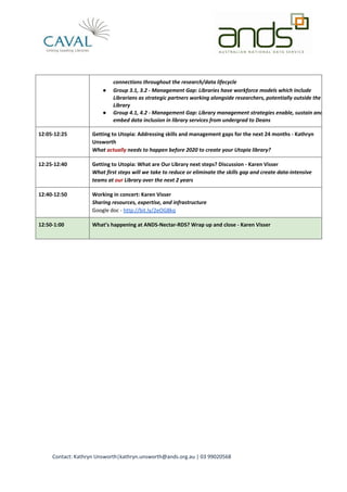 The document outlines a workshop conducted by CAVAL and ANDS aimed at improving library teams for a data-intensive future. Key discussions included the importance of addressing skills and management gaps in libraries, connecting library staff with researchers, and strategies towards creating effective, data-driven library environments. Attendees participated in activities such as SWOT analysis and discussions on next steps to enhance library services over the following two years.